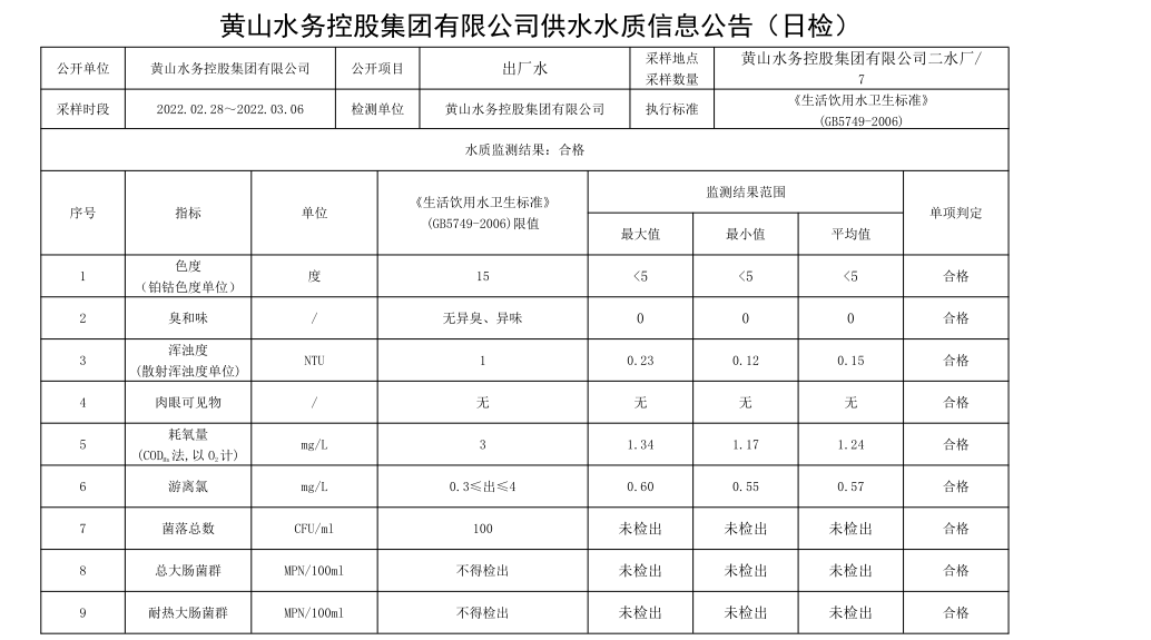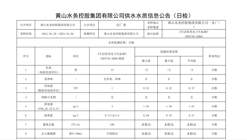 黃山水務(wù)控股集團(tuán)有限公司供水水質(zhì)信息公告【日檢,(2022.02.28_2022.03.06)】