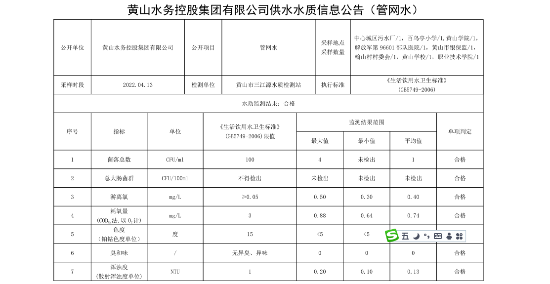 黃山水務(wù)控股集團(tuán)有限公司供水水質(zhì)信息公告(管網(wǎng)水,2022年04月上)