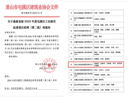 近日,2022年度屯溪區(qū)工程建設(shè)優(yōu)秀項目經(jīng)理評選結(jié)果公布,黃山水務(wù)控股集團(tuán)有限公司6名項目經(jīng)理獲此項殊榮。